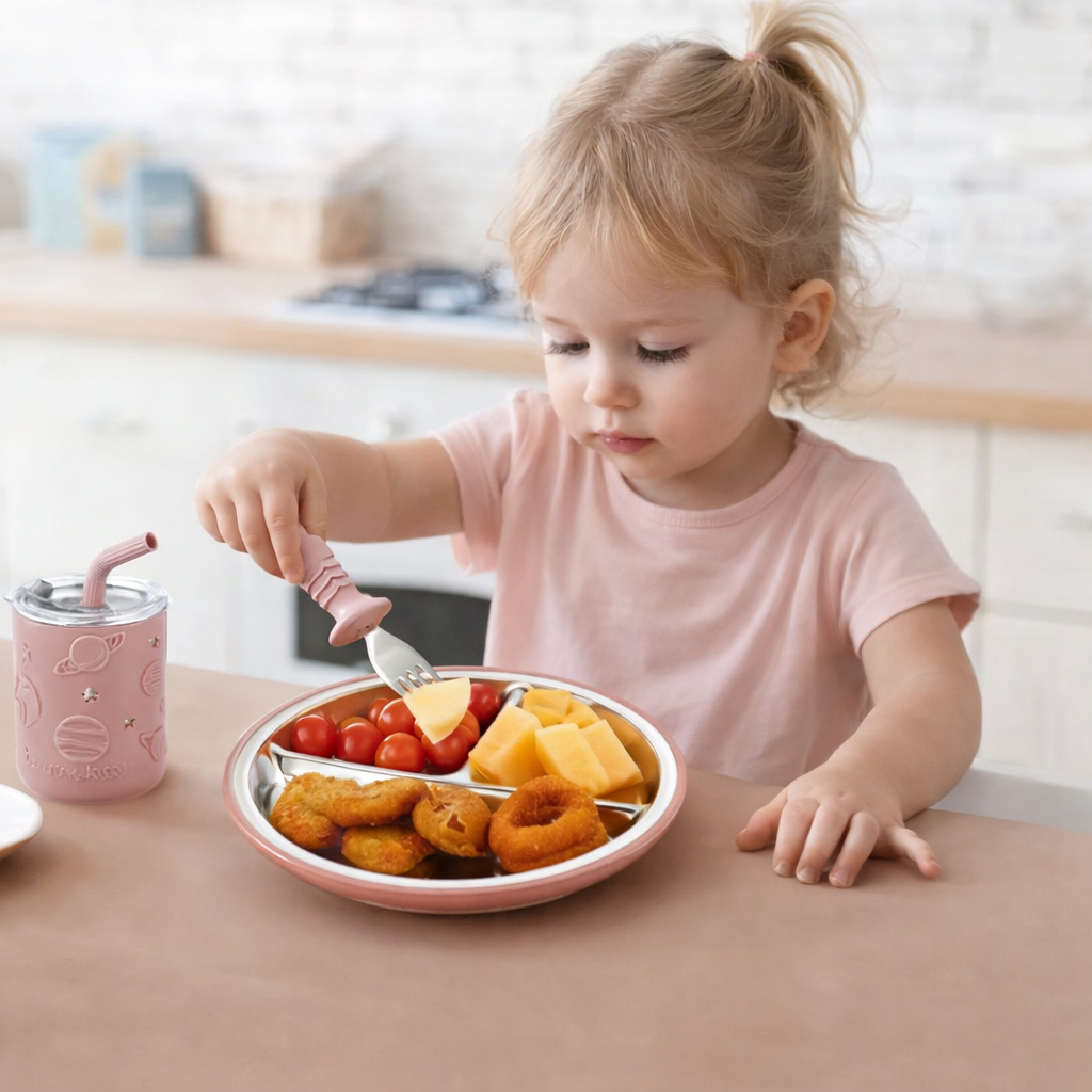 Some parents prefer to start with a complete Montessori-style toddler feeding set that includes a stainless steel plate, toddler-sized fork and spoon, and a small cup. These sets make it easier to create a simple, consistent mealtime setup where children can practice feeding themselves using real materials designed for their stage of development.