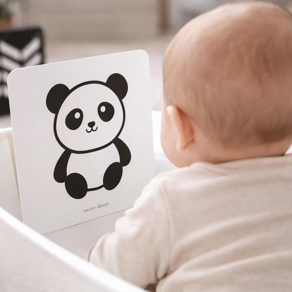 Black and white flashcards are often used for short, calm moments of focus, offering just enough stimulation without overwhelming your baby.